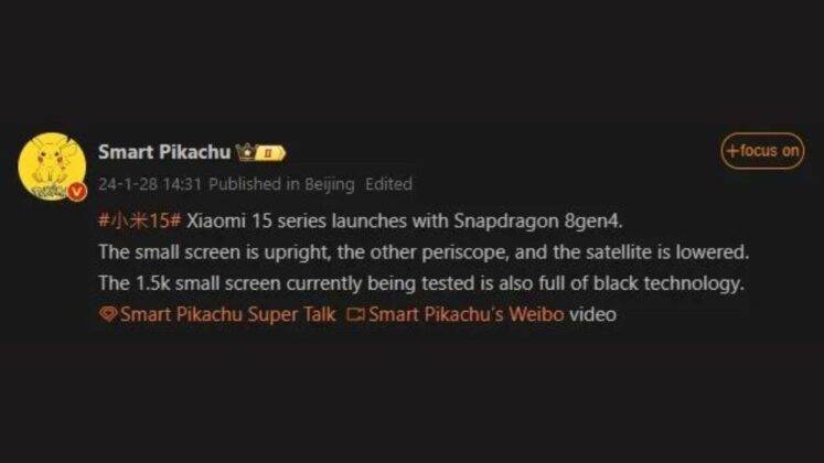 - माइक्रोब्लॉगिंग साइट वीबो पर एक अन्य टिपस्टर डिजिटल चैट स्टेशन ने Xiaomi 15 सीरीज का लॉन्च टाइमलाइन बताया है।