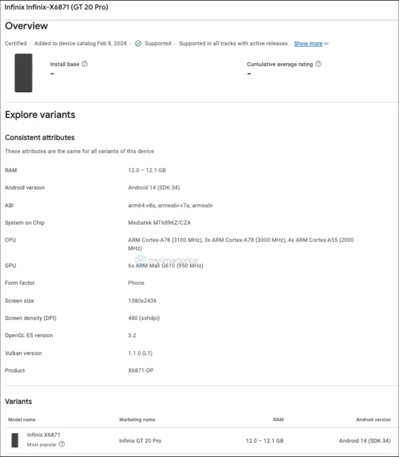 इसके अलावा गूगल प्ले कंसोल पर डिवाइस का फ्रंट लुक सामने आया है, जिसके अनुसार Infinix GT 20 Pro में सेंटर्ड पंच होल नॉच के साथ फुल स्क्रीन डिसप्ले होगा। वहीं, स्मार्टफोन ने 12GB रैम के साथ Google Play कंसोल डेटाबेस पर देखा गया है। वहीं, लिस्टिंग से यह भी पता चलता है कि हैंडसेट एंडरॉयड 14 के साथ प्री-लोडेड आएगा।