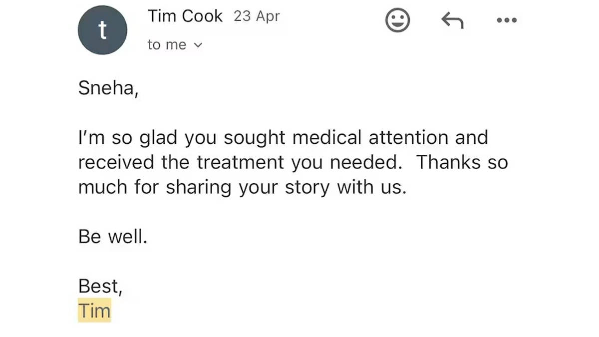 स्नेहा ने Apple Watch 7 के इस फीचर का अहसान माना तथा आभार प्रकट करते हुए Apple CEO Tim Cook को भी मेल लिखा। रिपोर्ट के अनुसार टिम कुम ने स्नेहा के मेल का जवाब भी दिया और एप्पल वॉच इस्तेमाल करने तथा एप्पल प्रोडक्ट्स पर भरोसा बनाए रखने के लिए धन्यवाद भी कहा है।