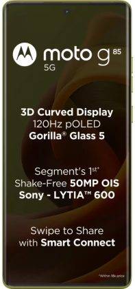Moto G85 5G फोन 20:9 आस्पेक्ट रेश्यो पर बना है जो 2400 x 1080 पिक्सल रेजोल्यूशन वाली 6.67 इंच की फुलएचडी+ पंच-होल डिस्प्ले सपोर्ट करता है। यह pOLED 3D Curved स्क्रीन है जो 120Hz रिफ्रेश रेट पर काम करती है। इस डिस्प्ले पर 1600निट्स ब्राइटनेस के साथ ही इन-डिस्प्ले​ फिंगरप्रिंट सेंसर भी मिलता है।
