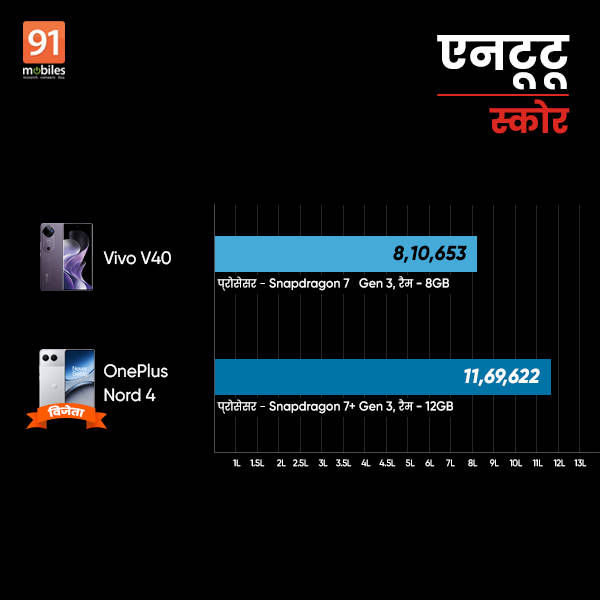 एनटूटू बेंचमार्क रिजल्ट की बात करें तो वीवो वी40 5जी फोन को यहां 8,10,653 स्कोर मिला है। वहीं वनप्लस नॉर्ड 4 ने 11,69,622 एनटूटू स्कोर हासिल किया है। इस बड़े मार्जिन के बावजूद सीपीयू स्कोर में वीवो स्मार्टफोन ने जहां 2,64,927 प्वाइंट्स पाए वहीं वनप्लस मोबाइल को 2,67,640 मिले। फर्क केवल 2713 का रहा।