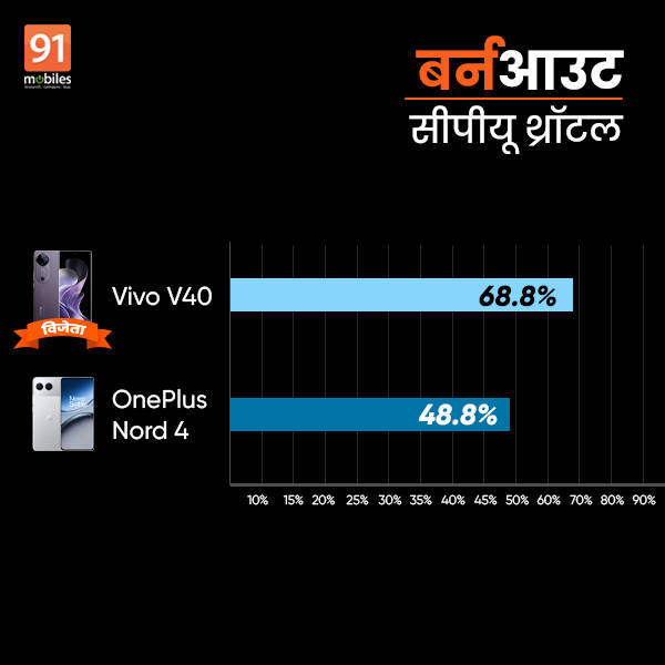 बर्नआउट बेंचमार्क करने पर वीवो वी40 का आउटपुट जहां 68.8% रहा वहीं इसके सामने वनप्लस नॉर्ड 4 की परफॉर्मेंस 48.8% तक ही पहुंच पाई। यह स्कोर हैरान कर देने वाला इसलिए भी था क्योंकि इससे पहले गीकबेंच और एनटूटू में वीवो वी40 पीछे रह गया था लेकिन थ्रॉटलिंग में इसके सीपीयू ने अच्छा काम किया।