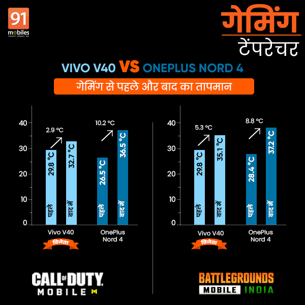 बीजीएमआई गेम को आधा घंटा खेलने के बाद वीवो वी40 5.3 डिग्री हीट हुआ तथा वनप्लस नॉर्ड 4 का तापमान 8.8 डिग्री बढ़ा। वहीं इस दौरान वीवो स्मार्टफोन और वनप्लस मोबाइल दोनों की बैटरी पावर में 7 प्रतिशत की गिरावट दर्ज हुई। BGMI में इन दोनों फोंस का औसत फ्रेम रेट क्रमश: 38.58FPS और 55.38FPS रहा।