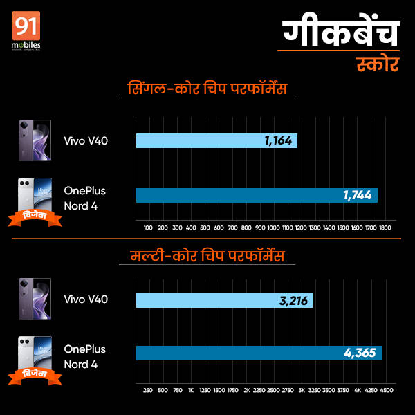 पहले सिंगल-कोर टेस्ट की बात करें तो वीवी वी40 जहां 1164 प्वांइट्स हासिल कर पाया है तथा वनप्लस नॉर्ड 4 ने 1744 पाया है। इसी तरह Vivo V40 का मल्टी-कोर गीकबेंच स्कोर 3216 रहा है जबकि OnePlus Nord 4 ने मल्टी-कोर गीकबेंच बेंचमार्क टेस्ट में 4365 स्कोर अचीव किया है।
