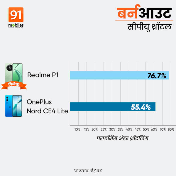 थ्रॉटलिंग टेस्ट के लिए बर्नआउट बेंचमार्क ऐप को तकरीबन 9 मिनट तक रन किया गया। इस दौरान Realme P1 के प्रोसेसर ने जहां 76.7 प्रतिशत क्षमता के साथ काम किया। वहीं OnePlus Nord CE4 Lite का चिपसेट सिर्फ 55.4 प्रतिशत ही परफॉर्म कर पाया। यानी दबाव की स्थिति में रियलमी मोबाइल यूजर्स का साथ निभा देगा।