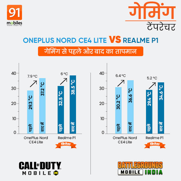 सीओडी गेम खेलने के दौरान वनप्लस नोर्ड सीई4 लाइट की औसत फ्रेम रेट 53.6एफपीएस रही। मोबाइल गेमिंग के दौरान इस फोन का टेम्परेचर 7.9 डिग्री बढ़ा तथा बैटरी 6 प्रतिशत ड्रॉप हुई। इस गेम में रियलमी पी1 5जी फोन का तापमान 6 डिग्री बढ़ गया तथा बैटरी 6 प्रतिशत कम हो गई है।