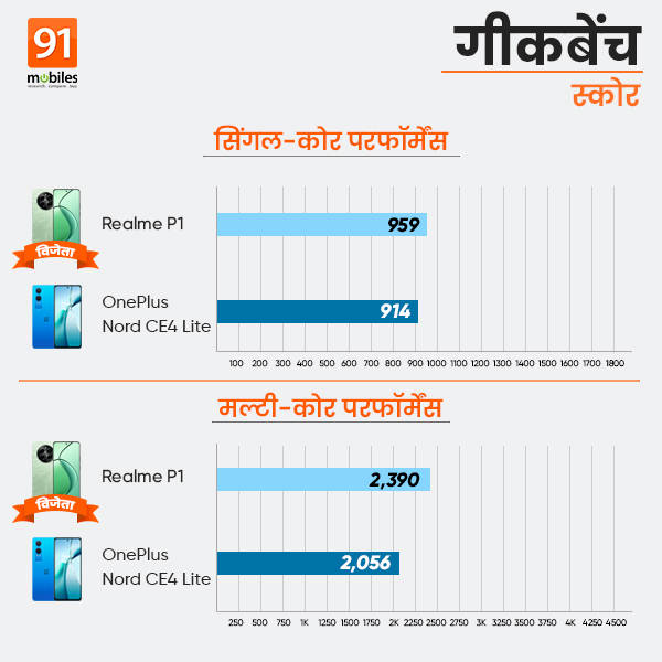 मल्टी-कोर गीकबेंच स्कोर में OnePlus Nord CE4 Lite ने 2056 प्वाइंट्स प्राप्त किए तथा Realme P1 का स्कोर 2390 रहा। यानी हल्के टास्क का काम हो या फिर हैवी प्रोसेसिंग दोनों में रियलमी पी1 5जी फोन की परफॉर्मेंस वनप्लस सीई4 लाइट से बेहतर साबित होगी।