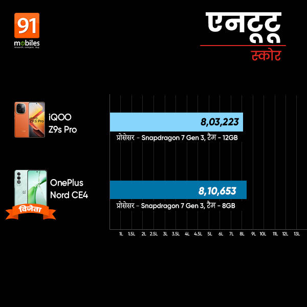 आइकू और वनप्लस मोबाइल में एनटूटू बेंचमार्क रन करने पर iQOO Z9s Pro का AnTuTu स्कोर 803223 आया तथा OnePlus Nord CE4 ने 819347 एनटूटू स्कोर अचीव किया। आप देखेंगे कि सभी आस्पेक्ट में वनप्लस फोन का एनटूटू स्कोर आइकू से ज्यादा जा रहा है। सिर्फ मेमोरी ही वह प्वाइंट है जिसमें ज़ेड9एस प्रो ने बढ़त बनाई है।