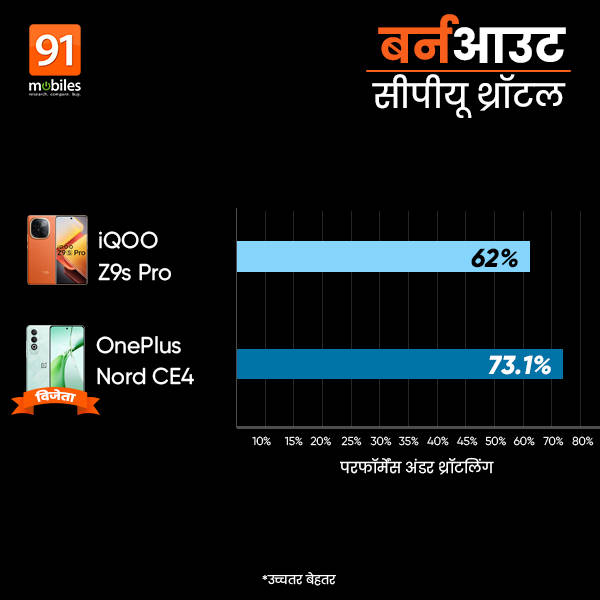 ससे पहले तो आपको बता दें कि थ्रॉटलिंग सिचुएशन में जो प्रोसेसर अपनी कैपेसिटी का जितना अधिक प्रतिशत हिस्सा काम में लगाता है, वह उतना ही बेहतर माना जाता है। हमारे टेस्ट में आइकू ज़ेड9एस प्रो 62 प्रतिशत क्षमता के साथ ही काम कर पाया जब्कि वनप्लस नोर्ड सीई4 ने 73.1 प्रतिशत क्षमता का प्रदर्शन किया।