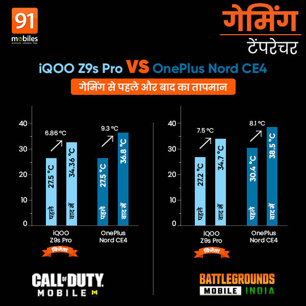 कॉल ऑफ ड्यूटी गेम को आधा घंटा खेलने के बाद आइकू ज़ेड9एस प्रो 6.86° हीट हो गया तथा वनप्लस नोर्ड सीई4 का तापमान 9.3° बढ़ गया। वहीं गेमिंग के बाद जब बैटरी चेक की गई तो आइकू की पावर 6% तथा वनप्लस की बैटरी 5% घट चुकी थी।