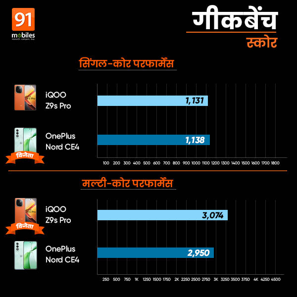 आइकू ज़ेड9एस प्रो ने सिंगल-कोर टेस्ट में 1131 प्वाइंट्स हासिल किए तथा वनप्लस का सिंगल-कोर स्कोर 1138 आया। इसी तरह मल्टी-कोर गीकबेंच बेंचमार्क स्कोर में iQOO Z9s Pro 3074 प्वाइंट्स प्राप्त किए तथा यहां OnePlus Nord CE4 का स्कोर 2950 रहा।