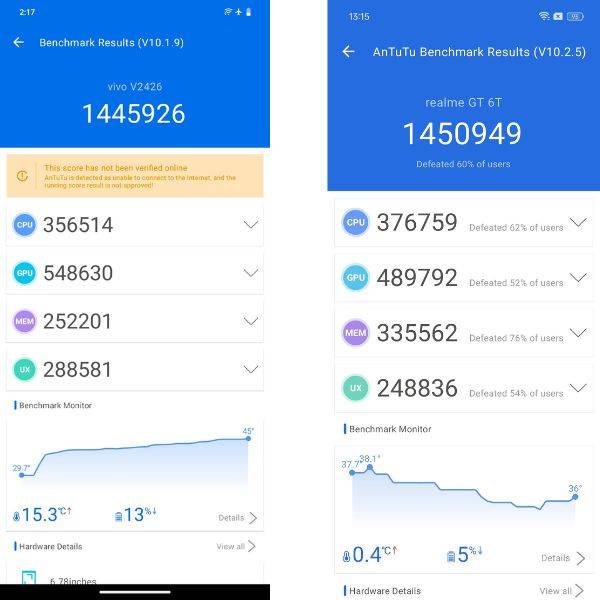 ओवरॉल Antutu स्कोर पर नज़र डालने से यह साफ हो जाता है कि ये दोनों ही मोबाइल परफॉर्मेंस के मामले में एक दूसरे तो कड़ी टक्कर देते हैं। यहां Vivo T3 Ultra का एनटूटू स्कोर 1,445,926 आया है तथा Realme GT 6T ने 1,450,949 एनटूटू स्कोर हासिल किया है। निश्चित रूप से दोनों स्कोर्स में अंतर तो है, लेकिन यह फर्क इतना मामूली है कि पुख्ता तौर पर नहीं कहा जा सकता है कि कोई एक फोन दूसरे पर ज्यादा भारी पड़ेगा।