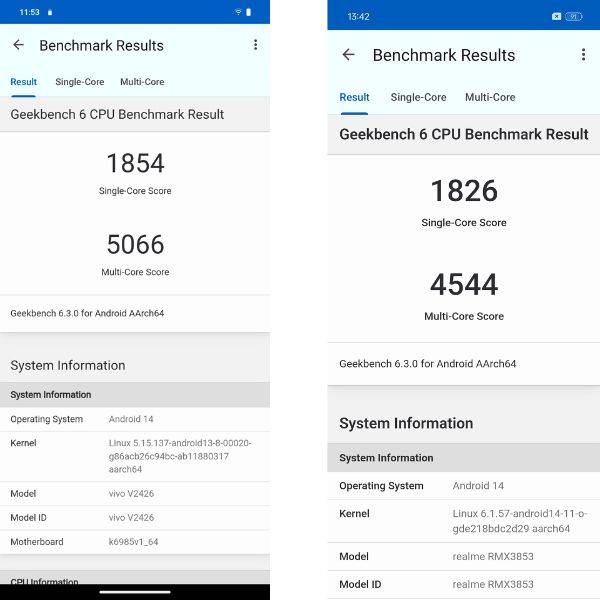 Vivo T3 Ultra और Realme GT 6T के सिंगल-कोर और मल्टी-कोर Geekbench स्कोर की तुलना करते समय, एक समान रुझान देखा जाता है। स्कोर्स लगभग बराबरी पर हैं। यहां मल्टी-कोर स्कोर्स में मामूल अंतर आया है जहां Vivo T3 Ultra थोड़ा बेहतर प्रदर्शन करता है। इस हिसाब से Vivo स्मार्टफोन मल्टी-थ्रेडेड टास्क जैसे वीडियो एडिटिंग इत्यादि को बेहतर तरीके से संभाल सकता है। लेकिन फिर भी इस अंतर को रियल स्मार्टफोन यूज के हिसाब से बहुत बड़ा नहीं कहा जाएगा।
