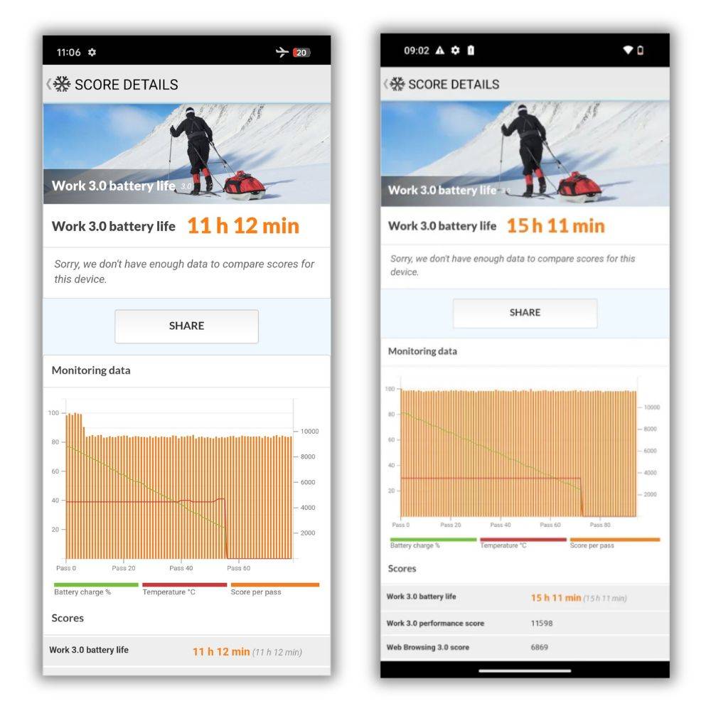 पीसीमार्क बैटरी टेस्ट यह जंचता है कि स्मार्टफोन की बैटरी को 100 प्रतिशत से 20 प्रतिशत से नीचे आने में कितना समय लगता है। हमने दोनों फोन पर स्क्रीन ब्राइटनेस 80 प्रतिशत पर सेट की और बैटरी को उस सीमा तक पहुंचने में लगने वाले समय को ट्रैक किया है।