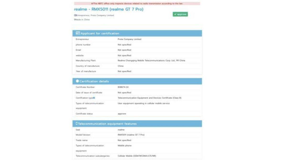 Realme GT 7 Pro थाईलैंड की NBTC वेबसाइट पर भी ऊपर बताए गए मॉडल नंबर के साथ देखा गया है। इस सर्टिफिकेशन से कोई और जानकारी नहीं मिली है। हालांकि यहां मौजूदगी से इसके जल्द ग्लोबल तौर पर आने की उम्मीद है। वहीं, अनुमान है कि फोन को भारत में भी नवंबर के मिड में लॉन्च किया है सकता है।