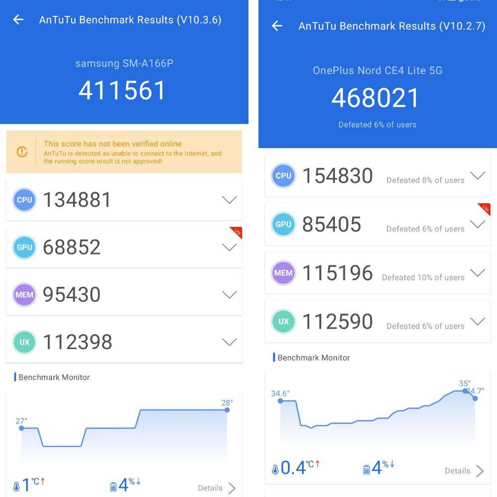 दोनों फोन के AnTuTu स्कोर एक दूसरे के काफी करीब हैं, जिसमें वनप्लस नॉर्ड CE4 लाइट एक बार फिर थोड़ा आगे है। स्कोर में असमानता काफी हद तक इसलिए है क्योंकि नॉर्ड CE4 लाइट CPU प्रदर्शन, GPU प्रदर्शन और मेमोरी स्कोर जैसे लगभग सभी पहलुओं में गैलेक्सी 16 से बेहतर स्कोर करता है। इन स्कोर के आधार पर यहां भी वनप्लस फोन आगे है।