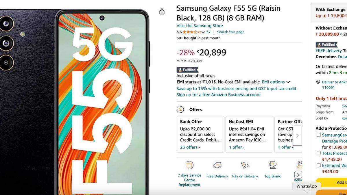जैसा कि हमने आपको बताया कि सैमसंग गैलेक्सी F55 अमेजन पर सीधे 6,100 रुपये की छूट पर बेचा जा रहा है। यह डिस्काउंट 8GB रैम + 128GB स्टोरेज वेरिएंट पर दिया जा रहा है, जिसे कंपनी ने 26,999 रुपये में लॉन्च किया गया था। लेकिन अभी यह अमेजन पर 20,899 रुपये में बेचा जा रहा है। वहीं, कंपनी की ऑफिशियल साइट पर फोन 20,999 रुपये में सेल किया जा रहा है।