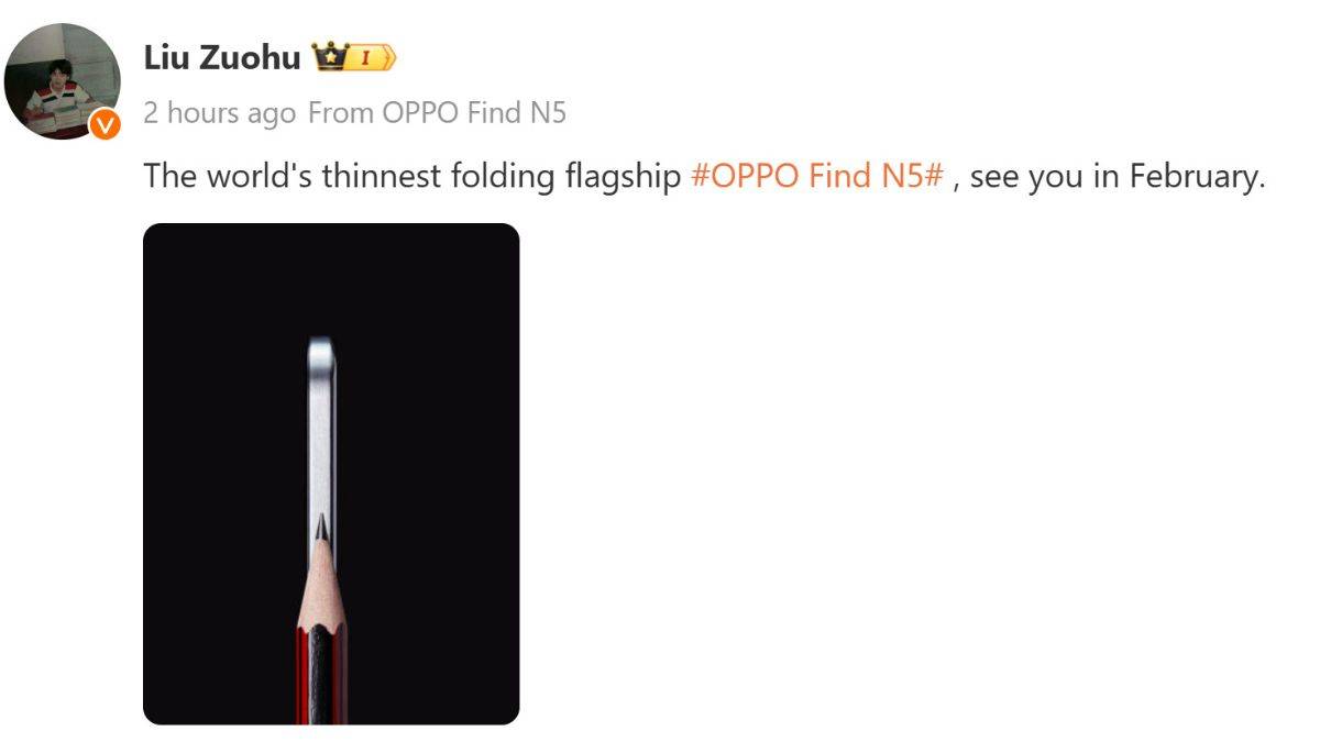 - यह दर्शाता है कि आगामी Oppo Find N5 अपनी अनफोल्ड अवस्था में एक पेंसिल से भी पतला होगा। स्मार्टफोन की मोटाई लगभग 7 मिमी बताई गई है।