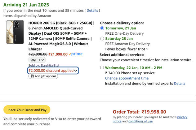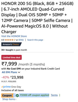 - इस एक्स्ट्रा छूट के बाद Honor 200 5G फोन का प्राइस घटकर 19,998 रुपये (₹21,998-₹2,000) हो जाएगा।