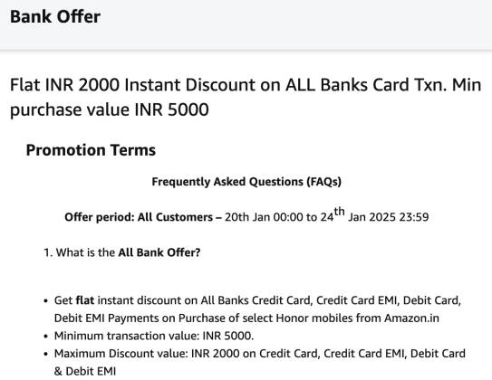 - इसके अलावा अमेजन प्लेटफॉर्म की ओर से किसी भी ऑनर स्मार्टफोन को खरीदने पर सभी बैंक कार्ड्स पर एक्स्ट्रा 2 हजार रुपये का डिस्काउंट भी मिलेगा।