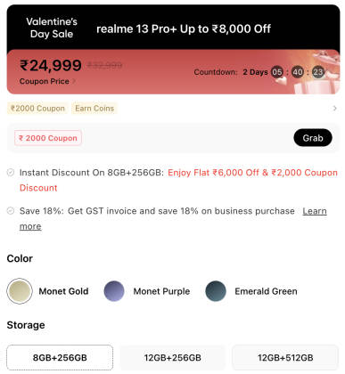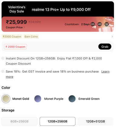 12जीबी रैम वाले रियलमी 5जी फोन को 7 हजार रुपये के डिस्काउंट के साथ कंपनी वेबसाइट सहित ऑफलाइन रिटेल स्टोर्स पर से भी खरीदा जा सकता है। वहीं फोन के अन्य दोनों वेरिएंट्स भी इस दौरान 6 हजार रुपये की छूट के साथ बिक्री के लिए उपलब्ध रहेंगे। यह स्मार्टफोन Monet Gold और Emerald Green कलर में परचेज किया जा सकता है।