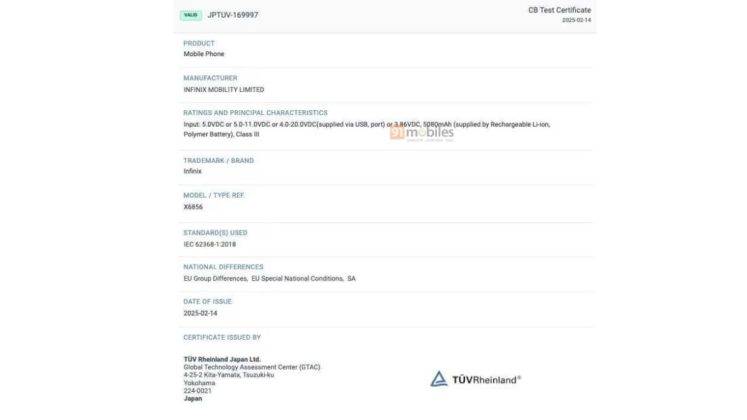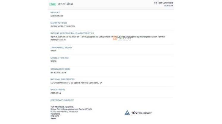 - 91मोबाइल्स द्वारा स्पॉट किए गए दो नए इंफिनिक्स फोन को मॉडल नंबर X6858 और X6856 के साथ TUV रीनलैंड सर्टिफिकेशन मिला है।
