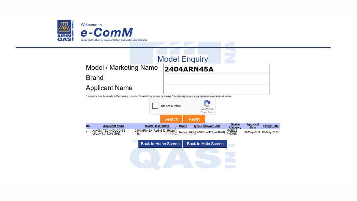 - SIRIM सर्टिफिकेशन में Xiaomi के Redmi 13x स्मार्टफोन का मॉडल नंबर 2404ARN45A है।