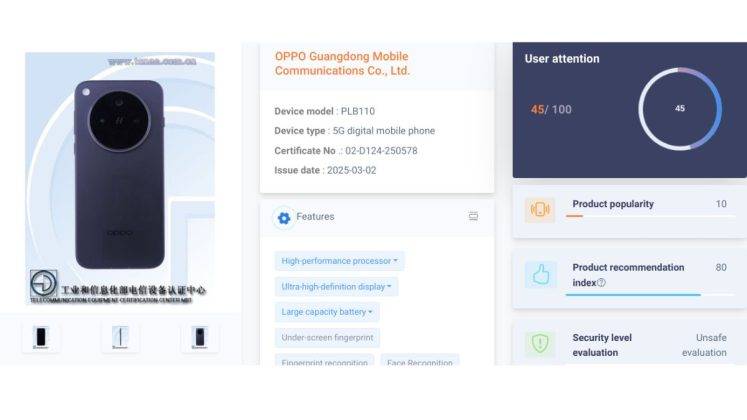 OPPO Find X8s+ को मॉडल नंबर PLB110 और सर्टिफिकेट नंबर 02-D124-250578 के साथ TENAA पर देखा गया है। इसके मुख्य स्पेसिफिकेशंस आगे दिए गए हैं: