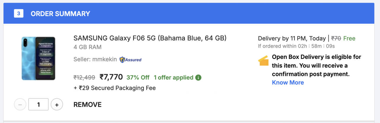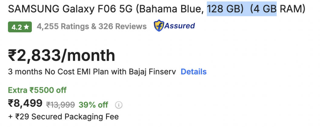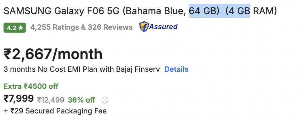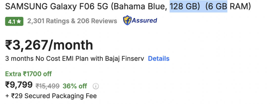 गौरतलब है कि सैमसंग इंडिया की ऑफिशियल वेबसाइट पर इस फोन को 4GB+128GB वेरिएंट को 11,499 रुपये और 6GB+128GB वेरिएंट को 12,999 रुपये में बेचा जा रहा है। लगे हाथ पाठकों को याद दिला दें कि शॉपिंग साइट फ्लिपकार्ट से सामान खरीदते वक्त 29 रुपये की सिक्योर्ड पैकेजिंग फीस भी वसूली जाती है। यह चार्ज गैलेक्सी एफ06 5जी फोन भी देना होगा।