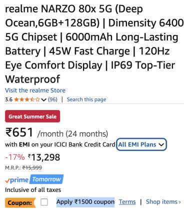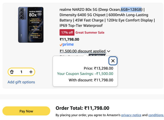 अगर आप इस फोन को कम कीमत में खरीदना चाहते हैं, तो बेहतर होगा कि जल्द से जल्द कूपन को रिडीम कर लें। 6जीबी रैम वाले realme Narzo 80x 5G फोन मिल रहे ऑफर की फुल डिटेल जानने या इस मोबाइल को खरीदने के लिए (यहां क्लिक करें)