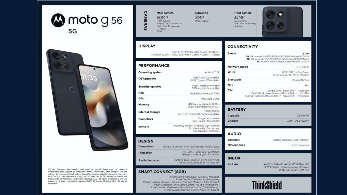 - मेमोरी: Moto G56 दो मेमोरी वैरियंट में आ सकता है जिसमें 4GB/8GB LPDDR4x RAM और 128GB/256GB UFS 2.2 स्टोरेज शामिल हैं। फोन में microSD कार्ड स्लॉट दिया जा सकता है जिससे स्टोरेज को 2TB तक बढ़ाया जा सकेगा। यह एक हाइब्रिड सिम स्लॉट हो सकता है।
