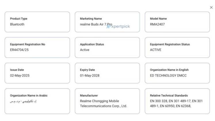 फोन के अलावा, XpertPick ने जानकारी दी है कि Realme Buds Air 7 Pro को UAE के TDRA द्वारा सर्टिफिकेशन मिला है। इसका मॉडल नंबर RMA2407 है और यह पहले से ही चीन में उपलब्ध है। अब देखना यह होगा कि क्या ये ईयरबड्स भी GT 7 सीरीज के साथ भारत में लॉन्च होते हैं या नहीं।