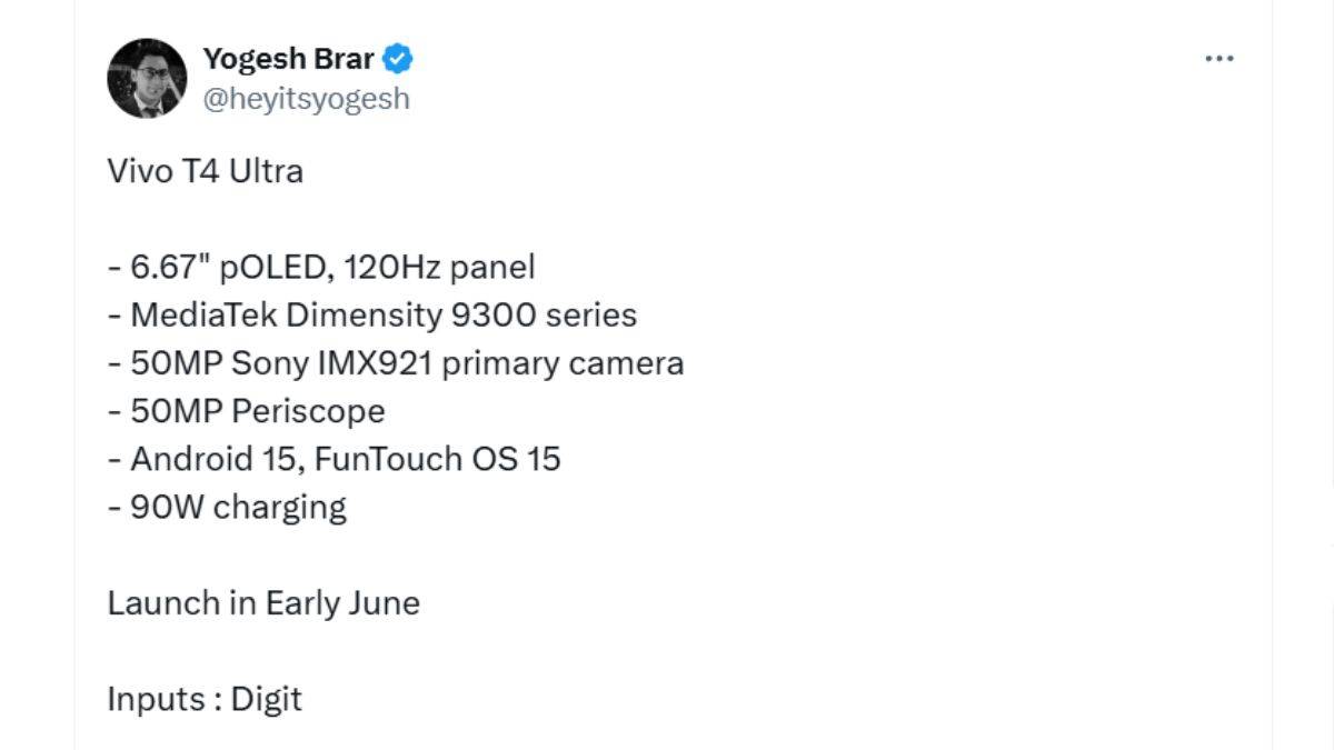 अप्रैल 2025 में लॉन्च हुए Vivo T4 के बाद अब Vivo एक और दमदार स्मार्टफोन लॉन्च करने की तैयारी में लग रहा है। आगामी फोन को Vivo T4 Ultra नाम से लाया जा सकता है। यह T4 का अपग्रेडेड वर्जन होगा और इसके स्पेसिफिकेशंस को देखकर कहा जा सकता है कि कंपनी मिड-रेंज सेगमेंट में एक नया बेंचमार्क सेट कर सकती है। टिपस्टर योगेश बरार के लेटेस्ट लीक के अनुसार, Vivo T4 Ultra में पावरफुल प्रोसेसर, शानदार डिस्प्ले और फ्लैगशिप-ग्रेड कैमरा सेटअप मिलने वाला है। वहीं, इसका लॉन्च जून 2025 की शुरुआत में होने की बात कही गई है। आइए, आगे डिटेल्स जानते हैं।