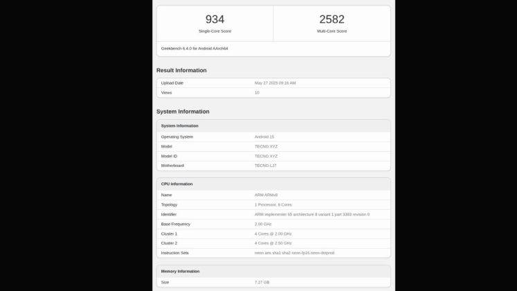 • Tecno Pova 7 5G ने सिंगल कोर में 934 और मल्टी कोर में 2582 का स्कोर हासिल किया है।