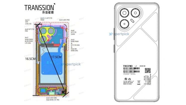 - फोन की स्कीमैटिक्स से पता चलता है कि इसकी हाइट 165mm और डायगोनल लंबाई 175mm होगी। इसी इमेज में एंटेना की पोजिशन और ड्यूल-बैंड Wi-Fi सपोर्ट की जानकारी भी मिलती है।