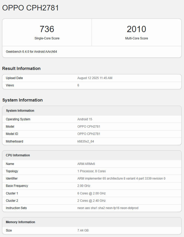ओपो ए6 प्रो 5जी फोन को गीकबेंच पर OPPO CPH2781 मॉडल नंबर के साथ लिस्ट किया गया है। यहां फोन में मीडियाटेक Dimensity 6300 चिपसेट दिए जाने की बात सामने आई है जिसकी क्लॉक स्पीड 2.00Ghz से लेकर 2.40Ghz तक तय है। बताते चलें कि ओपो ए5 प्रो भी इसी प्रोसेसेर पर काम करता है। यानी नए मॉडल में परफॉर्मेंस के नाम पर कुछ अपग्रेडेड नहीं मिलेगा।