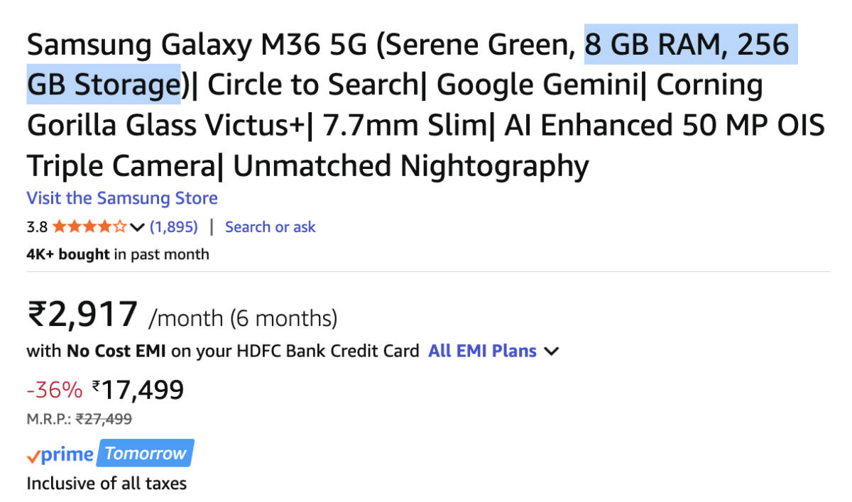 आजकल 64GB या 128GB वाले फोन की मेमोरी जल्दी भर जाती है। हाई रेजोल्यूशन फोटो-वीडियो और हैवी गेम्स के चलते ज्यादा स्टोरेज वाले स्मार्टफोन की डिमांड भी बढ़ रही है। अगर आप भी कोई नया 256GB Memory वाला मोबाइल खरीदने की योजना बना रहे हैं तो जून महीने में ही लॉन्च हुए Samsung Galaxy M36 5G पर 4,500 रुपये का तगड़ा डिस्काउंट मिल रहा है। यह 8GB RAM वाला 5G फोन 21,999 रुपये में लॉन्च हुआ था जिसे अब सिर्फ 17,499 में परचेज कर सकते हैं।