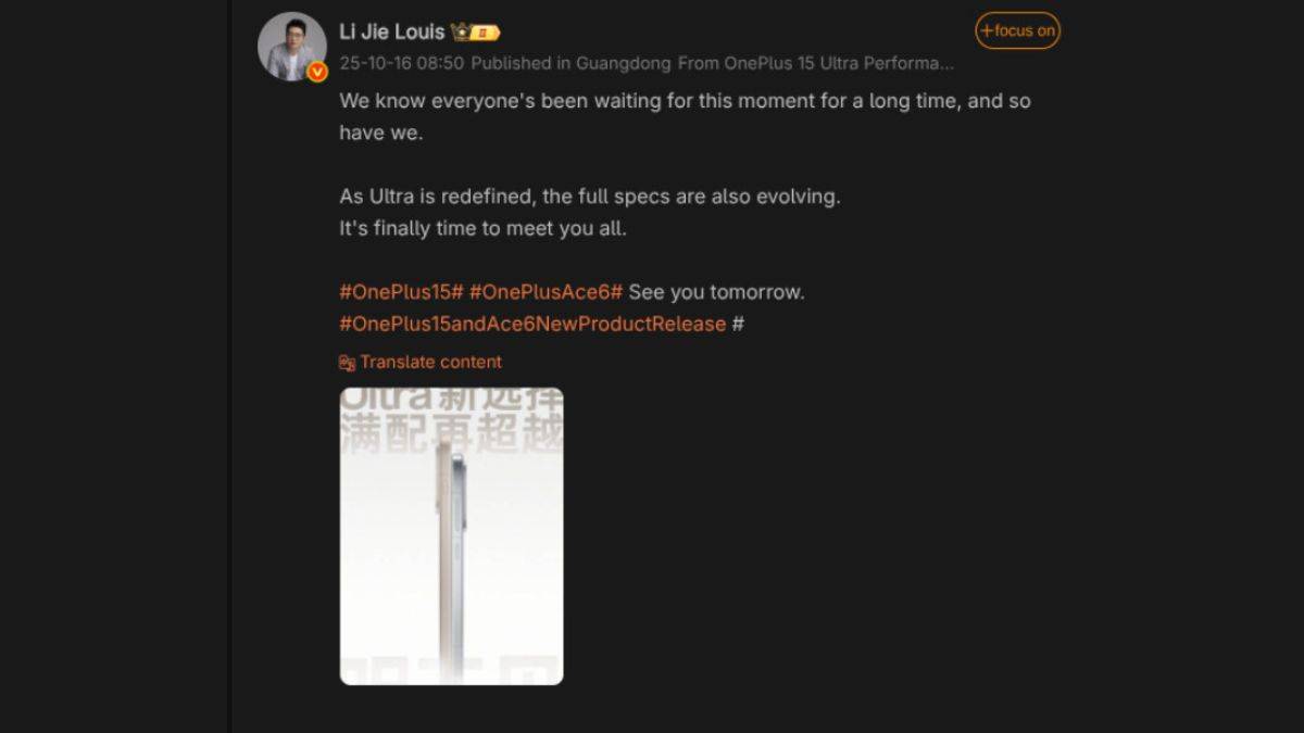 OnePlus अपने नए फ्लैगशिप स्मार्टफोंस को लेकर कई दिनों से सुर्खियों में हैं। इसी बीच कंपनी ने आखिरकार पेश होने की तारीख तय कर दी है। ब्रांड ने कंफर्म किया है कि OnePlus 15 और OnePlus Ace 6 चीन में कल यानी 17 अक्टूबर को लॉन्च होंगे। इस जानकारी की पुष्टि खुद कंपनी के चीन में प्रेसीडेंट ली जिए ने माइक्रो ब्लॉग्गिंग साइट वीबो के पोस्ट में की है। साथ ही टीजर इमेज भी सामने आई है। जिसमें दोनों फोन का डिजाइन दर्शाया गया है। आइए, आगे डिटेल्स जानते हैं।
