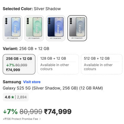सैमसंग इंडिया की ऑफिशियल वेबसाइट के साथ ही शॉपिंग साइट अमेजन और फ्लिपकार्ट पर भी Samsung Galaxy S25 5G फोन 74,999 रुपये में सेल के लिए उपलब्ध हो गया है। बताते चलें कि नए वाला Samsung Galaxy S26 स्मार्टफोन 87,999 रुपये में लॉन्च किया गया है। यानी देखा जाए तो गैलेक्सी एस25 5जी फोन गैलेक्सी एस26 की तुलना में 13,000 रुपये सस्ता बिक रहा है।