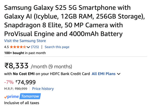 सैमसंग गैलेक्सी एस25 5जी फोन 12GB RAM + 256GB Storage के साथ 80,999 रुपये की कीमत पर इंडिया में लॉन्च हुआ था। लेकिन अब इस फोन मॉडल को 74,999 रुपये में सेल के लिए उपलब्ध करा दिया गया है। यानी Galaxy S25 को 6 हजार रुपये कम में परचेज किया जा सकता है। यह फोन का रियल सेलिंग प्राइस है और इतना सस्ता सैमसंग पाने के लिए किसी क्रेडिट कार्ड या कूपन इत्यादि की भी जरूरत नहीं पड़ेगी।