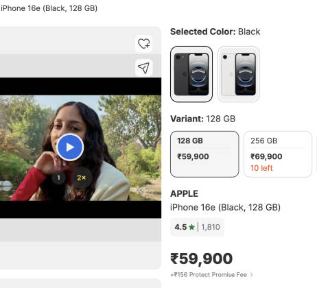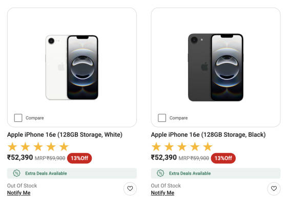 कंपनी की ऑफिशियल वेबसाइट यानी एप्पल डॉट कॉम पर खबर लिखे जाते वक्त आईफोन 16ई उपलब्ध नहीं था। इसी तरह अमेजन पर भी यह मोबाइल आउट ऑफ स्टॉक दिखा जा था। अन्य शॉपिंग साइट फ्लिपकार्ट पर आईफोन 16ई 59,900 रुपये में ही सेल के लिए उपलब्ध है। वहीं विजय सेल्स पर iPhone 16e 52,390 रुपये में बेचा जा रहा है।