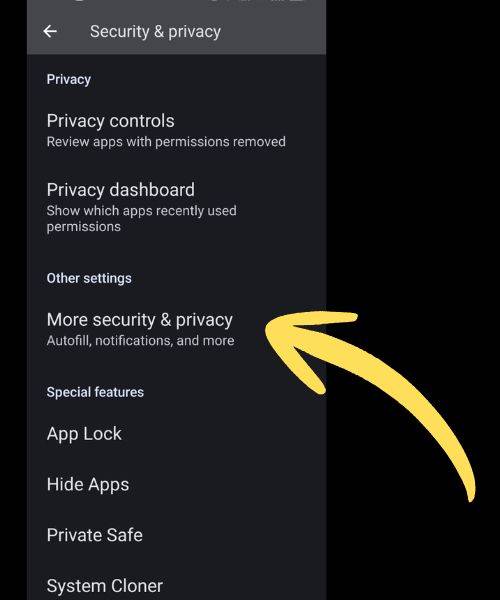 इसके लिए अपने फोन की Settings में जाएं और फिर आपको सिक्योरिटी ऐंड प्राइवेसी पर जाना है। यहां पर आपको फिर मोर सिक्योरिटी ऐंड प्राइवेसी वाले ऑप्शन पर क्लिक करना है।