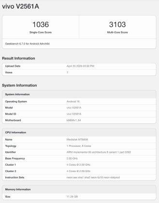 परफॉरमेंस के लिए Vivo Y600 Pro में MediaTek का MT6858T चिपसेट दिया जा सकता है। जिसे Dimensity 7300e नाम से लॉन्च किया जा सकता है। Geekbench लिस्टिंग के अनुसार यह चिप 2.5GHz तक क्लॉक स्पीड के साथ आता है। इसमें Mali-G610 MC2 GPU दिया गया है। फोन में 12GB तक RAM और Android 16 का सपोर्ट मिल सकता है। बेंचमार्क पर इसने सिंगल-कोर में 1,036 और मल्टी-कोर में 3,103 का स्कोर हासिल किया है, जिससे इसकी परफॉरमेंस अंदाजा लगाया जा सकता है।