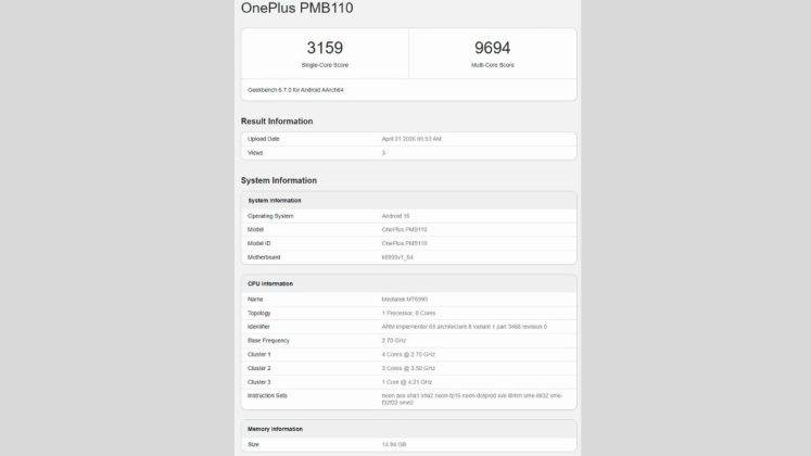 Geekbench लिस्टिंग के अनुसार OnePlus का डिवाइस मॉडल नंबर PMB110 के साथ सामने आया है, जिसे OnePlus Ace 6 Ultra माना जा रहा है। लिस्टिंग के अनुसार यह स्मार्टफोन MediaTek Dimensity 9500 चिपसेट से लैस होगा। यह प्रोसेसर हाई-एंड परफॉरमेंस के लिए जाना जाता है, जिससे गेमिंग और मल्टीटास्किंग में बेहतर अनुभव मिलने की उम्मीद है। डिवाइस में करीब 16GB RAM और Android 16 ऑपरेटिंग सिस्टम का सपोर्ट मिल सकता है। बेंचमार्क स्कोर की बात करें तो फोन ने सिंगल-कोर में 3,159 और मल्टी-कोर में 9,694 अंक हासिल किए हैं, जो इसे पावरफुल फ्लैगशिप श्रेणी में रखते हैं।