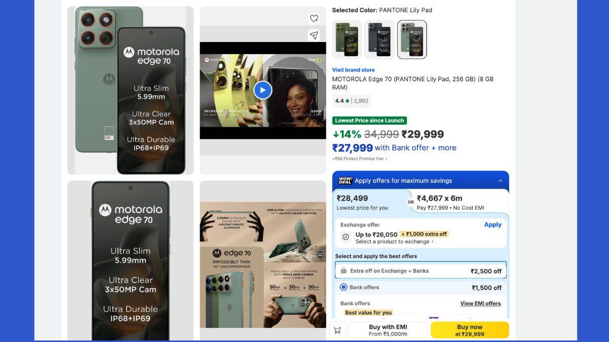 पिछले साल 29,999 रुपये की कीमत में लॉन्च हुआ Motorola Edge 70 एक बार फिर शानदार डील के साथ मिल रहा है। लॉन्च के बाद इस फोन की कीमत बढ़कर 32,999 तक पहुंच गई थी, लेकिन अब यह दोबारा 29,999 में उपलब्ध हो गया है। खास बात यह है कि ऑनलाइन शॉपिंग प्लेटफॉर्म Flipkart पर चल रहे बैंक और कैशबैक ऑफर्स के जरिए इसकी इफेक्टिव कीमत करीब 27,999 रुपये पड़ जाएगी। आइए, आगे डिटेल्स जानते हैं।