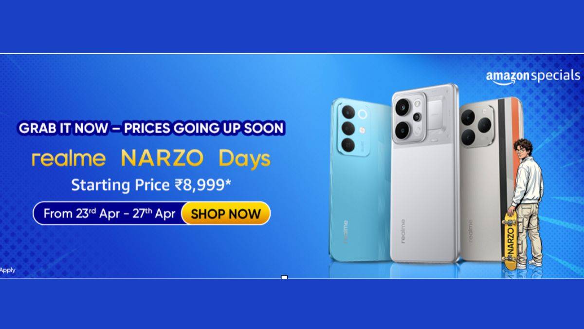 realme ने अपनी NARZO सीरीज पर खास सेल का ऐलान किया है। कंपनी की “NARZO Days Sale” आज से शुरू हो चुकी है। यह 27 अप्रैल तक चलेगी। इस दौरान ग्राहक Amazon पर realme NARZO सीरीज के स्मार्टफोंस पर आकर्षक डिस्काउंट, बैंक ऑफर्स, कूपन और नो-कॉस्ट EMI का फायदा उठा सकते हैं। आइए, आगे आपको पूरी डिटेल देते हैं।