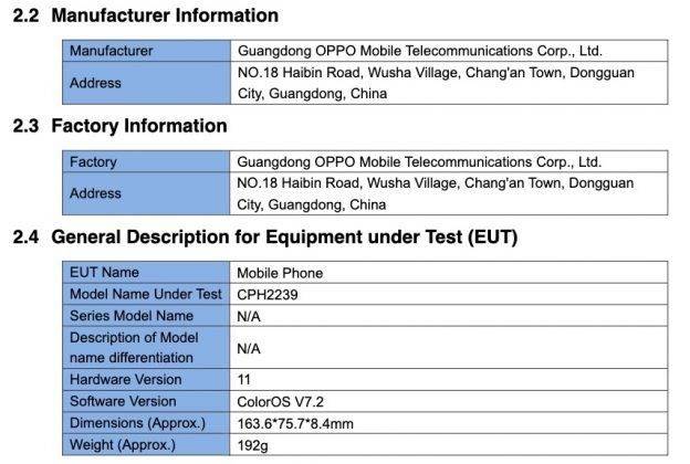 FCC लिस्टिंग में फोन मॉडल नंबर CPH2239 के साथ देखा गया है। लिस्टिंग से पता चलता है कि हैंडसेट 18W फ़ास्ट चार्जिंग सपोर्ट के साथ 5,000mAh की बैटरी के साथ आएगा। इसके अलावा, यह एंडरॉयड 11 पर आधारित ColorOS v7.2 के साथ भी एंट्री करेगा। इतना ही नहीं स्मार्टफोन का साइज 163.6×75.7×8.4 मिमी है और इसका वजन 2 ग्राम होगा। वहीं, दूसरी ओर बीआईएस सर्टिफिकेशन को टिपस्टर मुकुल शर्मा द्वारा साझा किया गया था, जिसमें हैंडसेट के बारे में कोई जानकारी सामने नहीं आई है।
