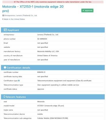 जैसा कि ऊपर बताया गया है, मोटोरोला एज 20 सीरीज़ 5 अगस्त को चीन में लॉन्च होगी। हाल ही में, अपकमिंग मोटोरोला एज 20 प्रो को 5 अगस्त के लॉन्च से पहले एनबीटीसी सर्टिफिकेशन प्राप्त हुआ था। डिवाइस का मॉडल नंबर XT-2153-1 देखा गया था। इसके अतिरिक्त, NBTC सर्टिफिकेशन भी मोनिकर को Motorola Edge 20 Pro के रूप में पुष्टि करता है। जहां तक Motorola Edge 20 के स्पेक्स का सवाल है, डिवाइस में FHD+ 2400×1080 पिक्सल रेजोल्यूशन के साथ 6.67-इंच OLED पैनल होने की संभावना है। पिछले लीक से पता चलता है कि डिवाइस स्नैपड्रैगन 870 SoC द्वारा संचालित होगा। डिवाइस 6GB/8GB और 12GB रैम कॉन्फ़िगरेशन में उपलब्ध होगा। चीजों के सॉफ्टवेयर पक्ष पर, हैंडसेट एंड्रॉइड 11 आउट ऑफ द बॉक्स चलाएगा। फोन में ट्रिपल रियर कैमरा सेटअप की सुविधा दी गई है जिसमें 108MP का प्राइमरी मुख्य कैमरा हो सकता है। डिवाइस में 4230mAh की बैटरी हो सकती है जिसके बारे में कहा जाता है कि यह 33W फास्ट चार्जिंग सपोर्ट देती है। इसे भी पढ़ें: Apple और Google फोन से ज्यादा ताकतवर होगा Motorola का यह फोन, जानें स्पेसिफिकेशन