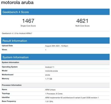 Geekbench 5 टेस्ट के रिजल्ट से पता चलता है कि Motorola Aruba कोडनेम वाला डिवाइस Moto E20 के नाम से मार्केट में लॉन्च हो सकता है। इस बेंचमार्क टेस्ट से जो पता चलता है उसकी माने तो Moto E20 स्मार्टफोन में 1.6GHz ओक्टा-कोर Unisoc चिपसेट दिया जा सकता है। मोटोरोला के इस फोन में 2GB का रैम और Android 11 के साथ लॉन्च होगा। ग्राफिकल परफॉर्मेंस के लिए फोन में Mali-G57 GPU दिया जाएगा।