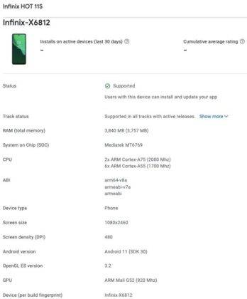 वहीं, Hot 11S की स्पेसिफिकेशंस की बात करें तो यह स्मार्टफोन Helio G88 SoC के साथ आएगा। हालांकि, Google Play कंसोल लिस्टिंग द्वारा दी गई जानकारी में डिवाइस MT6769 प्रोसेसर के साथ लिस्ट है, जो कि Helio G70 है। Infinix Hot 11S का रिजोल्यूशन 1080×2460 पिक्सल होगा। डिवाइस 4GB रैम से लैस होगा। इसके अतिरिक्त, जैसा कि पहले Infinix ने पुष्टि की थी, Hot 11S 128GB इंटरनल स्टोरेज के साथ 6GB रैम विकल्प में भी उपलब्ध होगा। इसे भी पढ़ें: Infinix Zero X Neo स्मार्टफोन भारत में MediaTek Helio G90 चिपसेट के साथ होगा लॉन्च